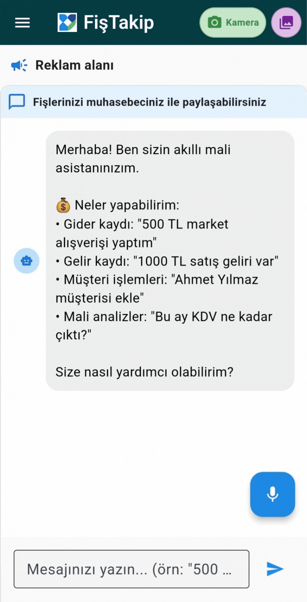 Yapay Zeka teknolojilerini kullanarak telefonunuzun kamerasından fişlerinizin görüntüsünü işliyoruz, bilgileri düzenliyoruz, listeliyoruz. Excel Dosyasıyla mail veya mesaj uygulamasıyla muhasebeye gönderilmesini sağlıyoruz.
